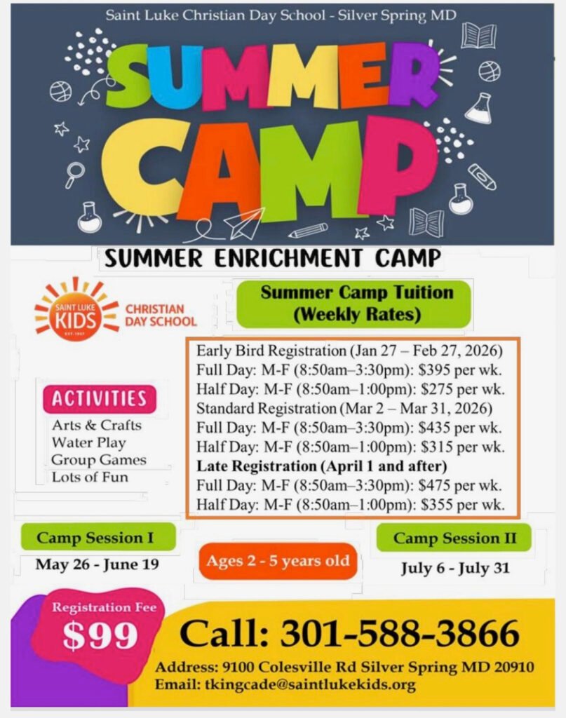 Summer is a time for creativity, friendship, and continued learning. Saint Luke Christian Day School is excited to offer our 2026 Summer Enrichment Camp for children ages 2 to 5 years old. Our camp program includes: • Arts & crafts • Water play • Group games • Engaging enrichment activities We offer flexible registration options with weekly rates based on registration timing. Camp Sessions Session I: May 26 – June 19 Session II: July 6 – July 31 Registration Fee: $99 Early Bird Registration January 27 – February 27, 2026 Full Day: $395 per week Half Day: $275 per week Standard Registration March 2 – March 31, 2026 Full Day: $435 per week Half Day: $315 per week Late Registration April 1 and after Full Day: $475 per week Half Day: $355 per week Spaces fill quickly, and we encourage families to register early to secure preferred sessions. To register or learn more, please contact our office at 301-588-3866 or visit saintlukekids.org.